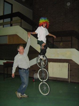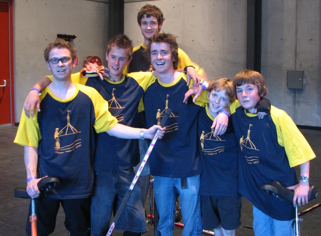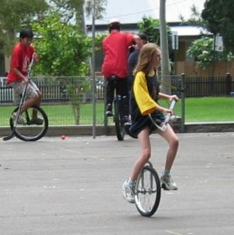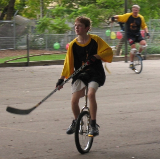 I think that this must be considered as the year of the unicycle for us. Sam and Abi are now so talented, but they have differinginterests where they focus their cycxling skills. True to nature, Abi loves performing, and has also found an undiscovered skill in track and field events. Sam loves playing unicycle hockey, a fast, exciting team game requiring a high level of skill to win. We have been going regularly to Wednesday-night club meetings during term-time, where fellow unicyclists just 'hang out, socialise and do their personal thing with friends. In March, the Canberra team took off to Sydney and play the hockey team who were the present national champions, to learn how exciting and intimidating it can be. Once home, Sam steadily enthused all the other players to come and play hockey with him, and a formidable team between the ages of 12 and 18 evolved, ready for the national championships at the end of September. The Canberra club's versatility helped a lot, because they could do so much more than only play hockey. The opposition had problems coping with the defence who could play riding backwards as well as they could riding forwards, and therefore simply couldn't be dodged around as they tried to steal the ball. The best thing of all was the Canberra team won: they are the national champions! Sam was the youngest in the team aged 12; playing an adult opposition. It is hard to overestimate the pride felt by all.